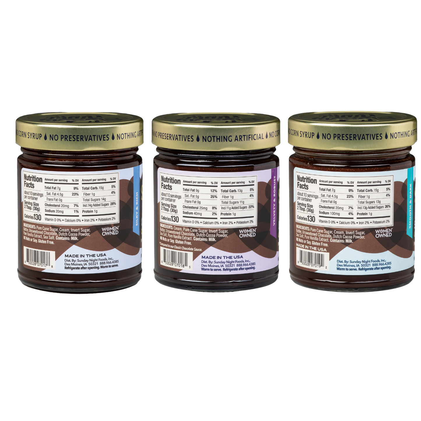 Sunday Night Foods Chocolate Lover's: Classic, Bittersweet, Sea Salt Chocolate Sauces 10 oz- 3 Pack