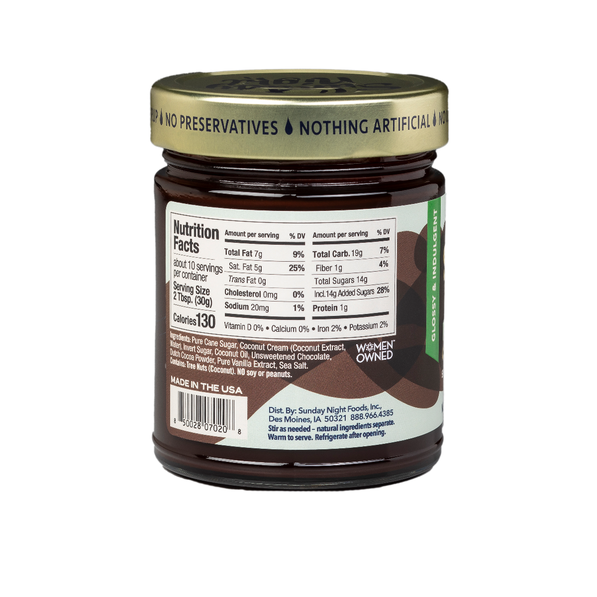 Ingredients: Pure Cane Sugar, Coconut Cream (Coconut Extract, Water), Invert Sugar, Coconut Oil, Unsweetened Chocolate, Dutch Cocoa Powder, Pure Vanilla Extract, Sea Salt.